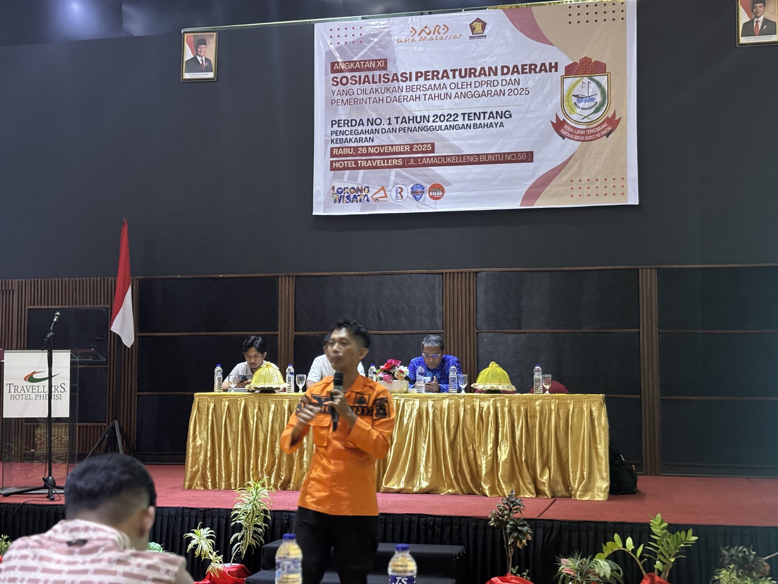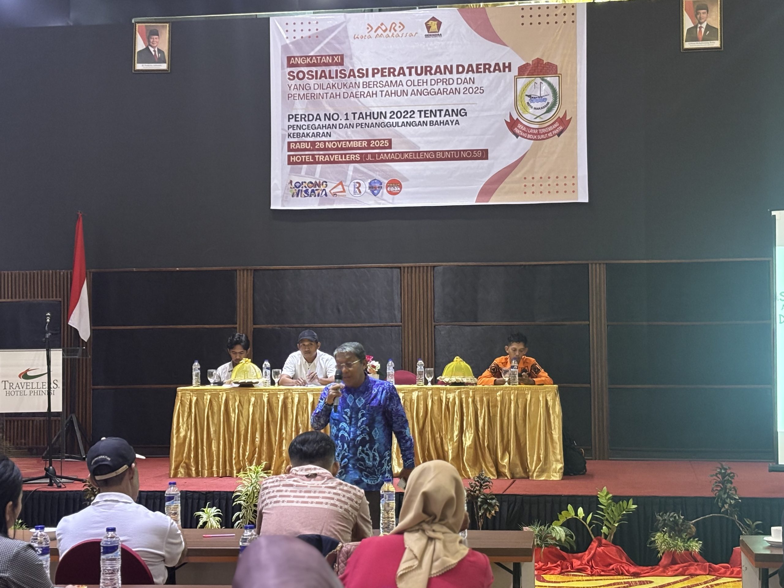 Makassar, Lokanews.id – Sekretariat DPRD Kota Makassar bersama Badan Penanggulangan Bencana Daerah (BPBD) Kota Makassar melaksanakan Sosialisasi Peraturan Daerah Nomor 1 Tahun 2022 tentang Pencegahan dan Penanggulangan Bahaya Kebakaran. Kegiatan ini berlangsung pada Rabu, 26 November 2025 di Hotel Travellers dan dihadiri berbagai unsur masyarakat serta pemangku kepentingan terkait. Sosialisasi ini digelar sebagai upaya memperkuat pemahaman publik mengenai regulasi kebakaran dan meningkatkan kesiapsiagaan warga dalam menghadapi potensi bencana di lingkungan masing-masing.